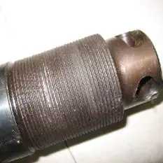 閥桿與閥桿套連接螺紋為M56×2mm,按照GB-T197-2003《普通螺紋公差》標準,螺紋配合間隙應為0.12~0.25mm,而實際安裝時閥桿和閥桿套配合間隙為0.40~0.70mm,這就使得內(nèi)外螺紋接觸面積過小,螺紋受力時極易損壞,如圖5所示。